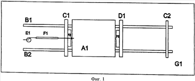 На фиг.1 схематично изображен трехмерный силомер в виде узла из компонентов, а на фиг.2 – его продольный разрез. Трехмерный силомер содержит нижнюю монтажную пластину G1, к которой он прикреплен. Корпус А1 подшипника предпочтительно имеет два вала В1 и В2, проходящие через линейный подшипник. Валы В1 и В2 проходят параллельно через линейные подшипники в корпусе подшипника. Две поперечины (поперечные балки) С1 и С2 с каждой стороны линейного подшипника прикреплены к монтажной пластине, предпочтительно посредством резьбового соединения. Каждый из валов В1 и В2 закреплен в поперечине. Еще одна поперечина D1, выполненная регулируемой, установлена между линейным подшипником А1 и одной из неподвижных поперечин С2.