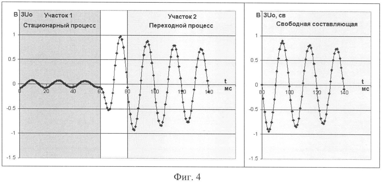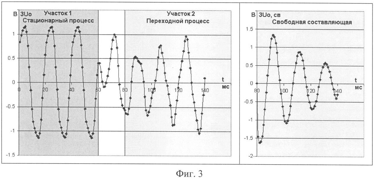 Приведенная на фиг.3 одна из экспериментальных осциллограмм напряжения смещения нейтрали 3U0 фиксирует стационарный и переходной процессы в контуре нулевой последовательности при нормальном режиме работы сети, когда все отходящие линии секции находятся в работе. Измеряемая секция заземлена через подземляющий трансформатор типа ТМ400/6 и два параллельно включенных дугогасящих реактора: реактор типа ЗРОМ 300/6У1 с отпайками на токи 24,5 48,6 А, подключенный 1-й ступенью, и плунжерный реактор типа РЗДПОМ 300/6У1 на токи 13,1 65,5 А. Возмущение в контуре нулевой последовательности сети создается источником импульсного тока, подключенным к сигнальной обмотке плунжерного реактора. Приведенная справа на фиг.3 осциллограмма 3U0.cв соответствует свободной составляющей переходного процесса, выделенной из экспериментальной осциллограммы путем наложения участка 2, соответствующего переходному процессу, на участок 1, соответствующий стационарному процессу. Результаты обработки осциллограммы свободной составляющей следующие: собственная частота измеряемого контура составляет 51,5 Гц, что соответствует коэффициенту расстройки сети 6,5%, а его добротность – 7,07, что соответствует общей активной проводимости измеряемого контура – 1,57 мСм. Параметры сети: емкость сети относительно земли – 34,3 мкФ, активная проводимость фаз – 1,247 мСм.