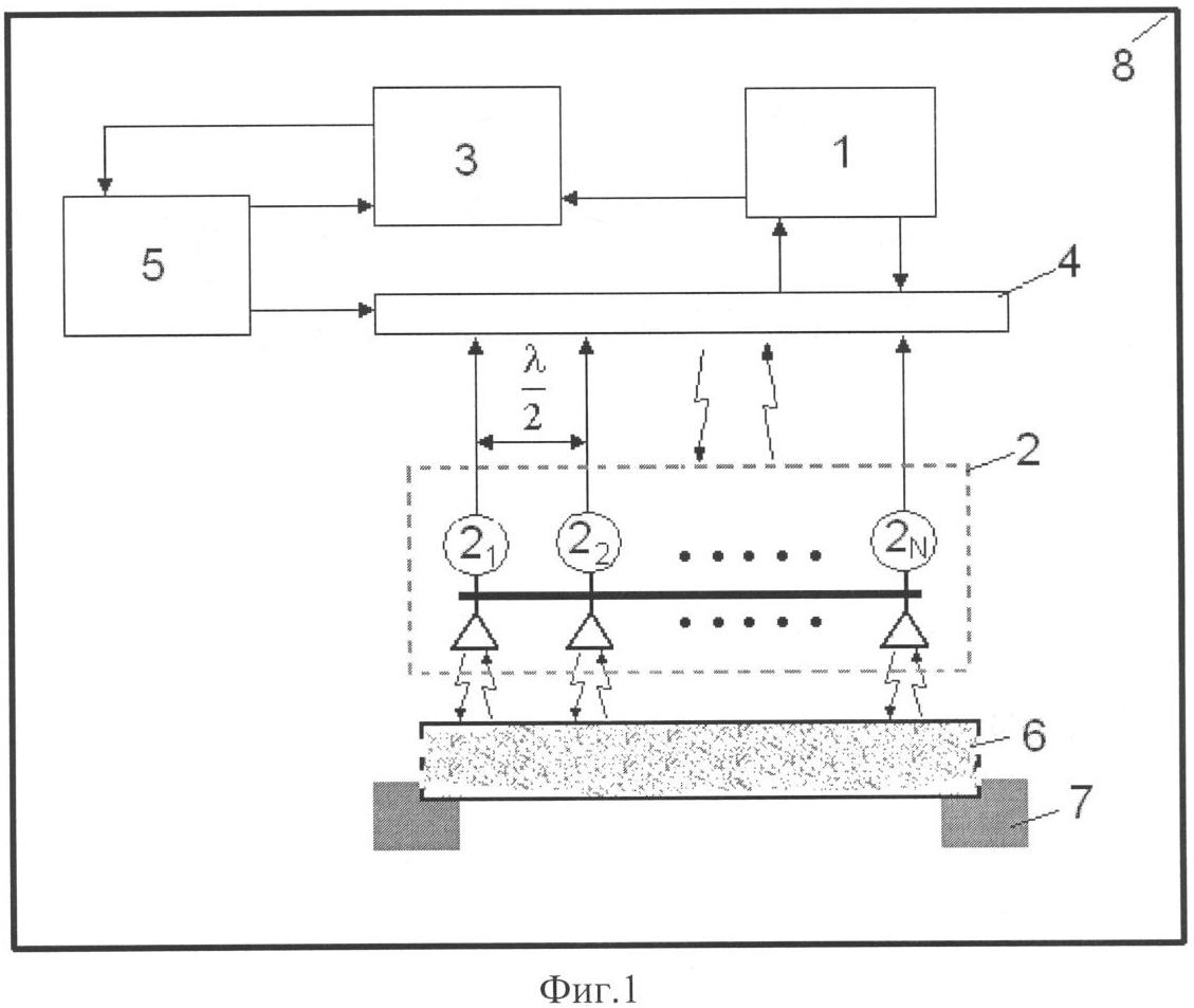Объект измерений 6 размещают на подставке 7. Приемо-передающее устройство 1 вырабатывает высокочастотные колебания, которые через переключатель приемо-передающих элементов антенной системы 4, управляемый блоком управления переключателем приемо-передающих элементов антенной системы 5, поступают к первому приемо-передающему элементу 21 антенной системы 2 и объект измерения 6 облучается ЭМВ, отраженные ЭМВ от объекта измерения 6 последовательно принимаются всеми приемо-передающими элементами 21÷2N антенной системы 2. Массив данных записывается в блок оценки КО ЭМВ 3 (ЭВМ). Затем переключатель приемо-передающих элементов антенной системы 4 с помощью блока управления переключателем приемо-передающих элементов антенной системы 5 подключает следующий приемо-передающий элемент 21÷2N антенной системы 2. Цикл повторяется до того, как исследуемый объект 6 будет облучен всеми приемо-передающими элементами 21÷2N антенной системы 2.