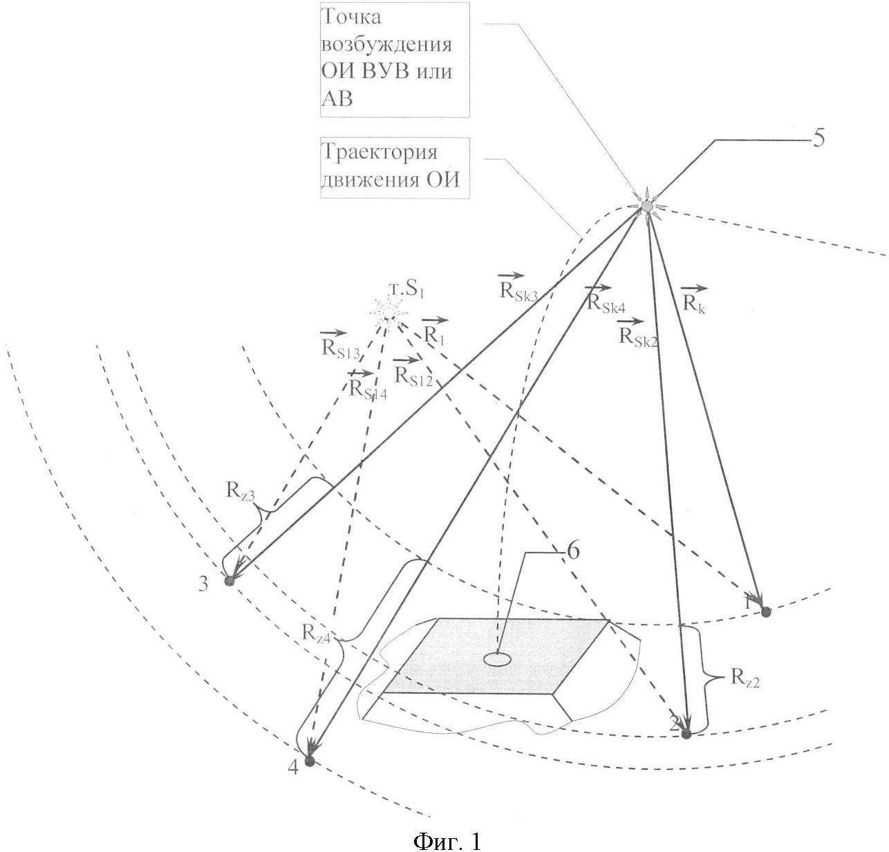 С использованием расстояний Rzi, RSki и известных координат ИТ определяют координаты объекта 5. За координаты объекта 5 принимают координаты такой точки Sk, для которой выражение (1) принимает минимальное значение.