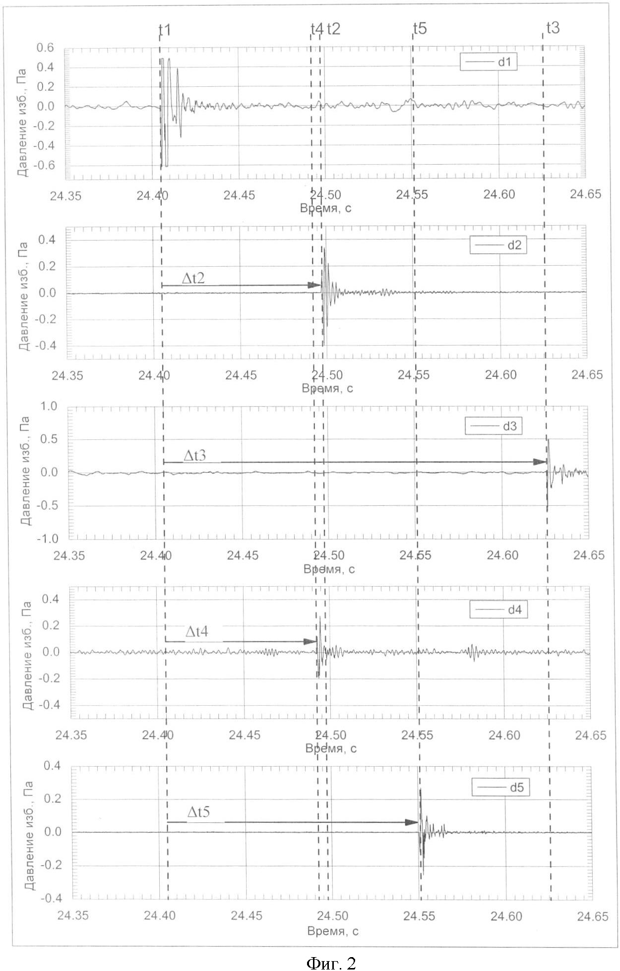 Определены моменты времени t1, t2, t3, t4, t5, соответствующие достижению сигналом каждого из датчиков, соответственно d1, d2, d3, d4, d5 (см. фиг.2 и табл.1 фиг.4).