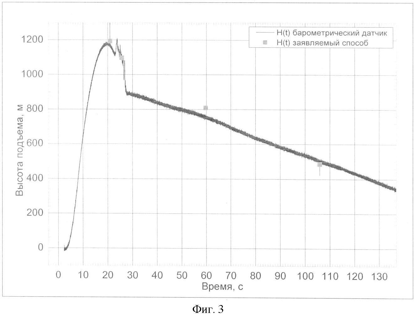 Работоспособность способа подтверждена в экспериментах по его отработке, в которых пространственные координаты размещения объекта были известны заранее. Кроме того, он успешно применялся в полигонных условиях. В экспериментах с объектами, оснащенными барометрическим датчиком измерения высоты подъема способ показал хорошее совпадение результатов с измерениями высоты подъема барометрическим датчиком, установленным на изделии. Сопоставление результатов измерения высоты приведено на фиг.3.