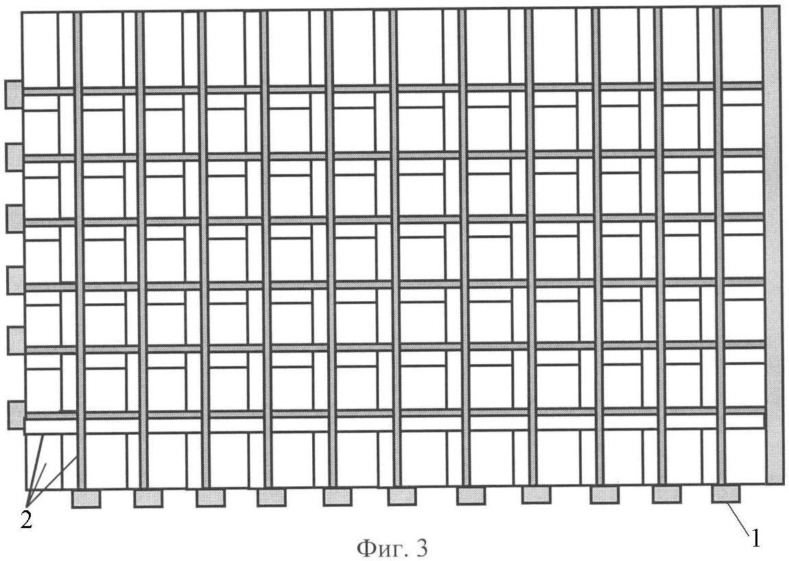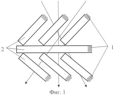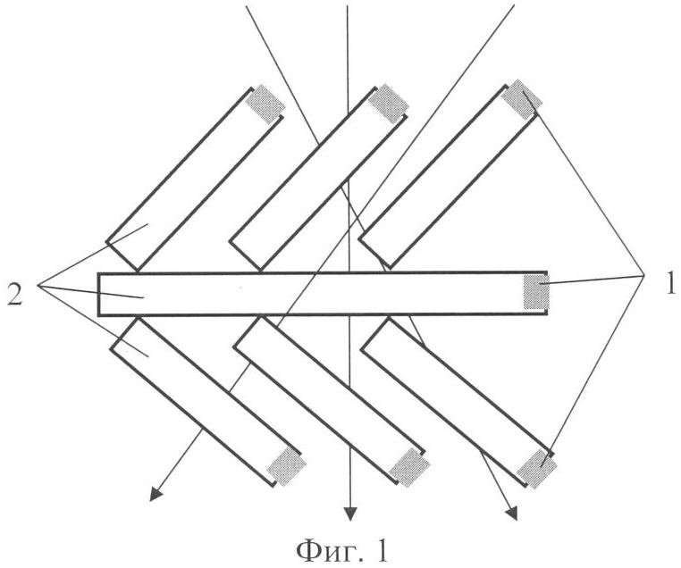 На фиг.3 представлен детектор, составленный из элементов фиг.2, где 1 – фотоприемные устройства, 2 – сцинтиллирующие пластины. Дополнительные пластины установлены с пересечением, под углом друг к другу и выполнены в виде пространственной решетки.