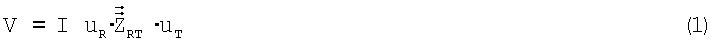 Ниже представлена математическая теория, лежащая в основе измерений с использованием скрещенных диполей (например, передатчика Т и приемника R, показанных на фиг.3А). Для передатчика (передающей антенны), несущего ток I, напряжение V, измеряемое в приемнике, может быть выражено через тензорный передаточный импеданс :
