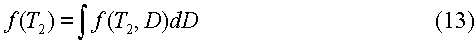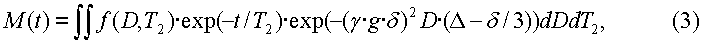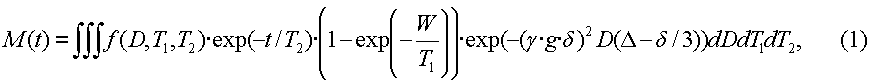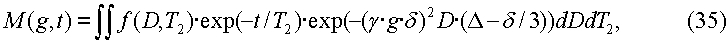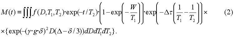Уравнение (1) представляет собой интегральное уравнение Фредгольма первого рода, которому удовлетворяет трехмерная функция f(D, T1, T2) распределения коэффициентов диффузии и времен релаксации. Показательным множителем в подынтегральном выражении, который включает в себя Т2, учитывается спин-спиновая релаксация намагниченности, тогда как множителем, который включает в себя Т1, учитывается неполная поляризация намагниченности при условии, что она начинается от первоначального состояния нулевой намагниченности. Время W восстановления предшествует первому 90° импульсу, показанному на фиг.4. Если время W ожидания достаточно продолжительное (например, допустим в 5 раз больше самого продолжительного Т1 в пробе), то коэффициент неполной поляризации равен единице. В этом случае трехмерная функция распределения приводится к двумерной функции f(D, T2) распределения.