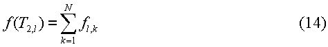 T2,l релаксации, где l=1,2,3, N, представляют собой набор из N фиксированных времен релаксации, которые перекрывают диапазон ожидаемых значений Т2. Удобно, но необязательно, выбирать фиксированные времена релаксации равномерно разнесенными по логарифмической шкале. Точно так же Dk является набором из N фиксированных коэффициентов диффузии, выбранных для перекрытия диапазона ожидаемых значений D. Матрица размера N×N, fl,k, представляет собой дискретное представление непрерывной двумерной функции распределения диффузии и времен релаксации. Эхо-сигналы наблюдаются в моменты времени: