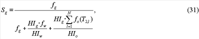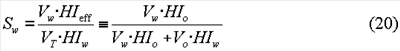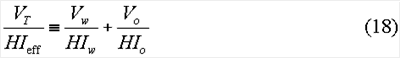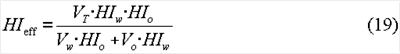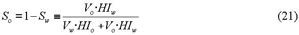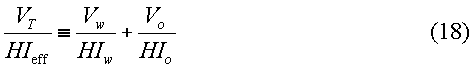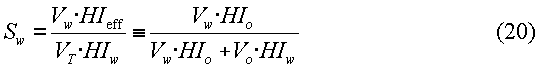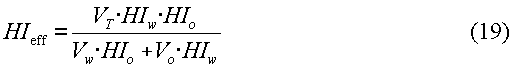 HIw и HIo представляют собой водородные показатели воды и нефти, соответственно. Водородный показатель (HIw) воды может быть вычислен на основании эмпирических соотношений, если соленость воды известна из результатов измерения удельного сопротивления или других измерений. Перестановкой членов в уравнении (18) эффективный водородный показатель (HIeff) может быть выражен через исходные объемы флюидов и водородные показатели воды и нефти: