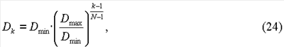 где k=1,2, ,N; Dmin и Dmax задают минимальный и максимальный пределы значений коэффициентов диффузии, используемых при вычислении fl,k, и