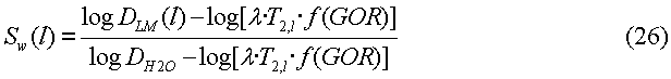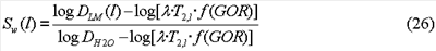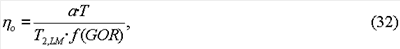 где Т – температура в градусах Кельвина, f(GOR) 1 – определяемая эмпирически функция (Lo et al., Mixing rules and correlations of NMR relaxation time with viscosity, diffusivity, and gas/oil ratio of methane/hydrocarbon mixtures , в: SPE Journal, vol. 7, 1, p.24-34, March 2002), а параметр a (0,004-0,009) с·сП·K-1 зависит от типа нефти (Freedman and Heaton, Fluid characterization using nuclear magnetic resonance logging , в: Petrophysics, vol. 45, 3, p.241-251, 2004). Это изменение параметра означает, что вязкость можно оценить только с точностью до множителя, имеющего значение около 2. В уравнении (32) вязкость выражена в единицах сантипуаз (сП), а логарифмическое среднее времени релаксации – в секундах.