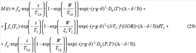 Должно быть понятно, что уравнения, подобные уравнению (29), могут быть применены к наборам данных, полученным по последовательности градиентов импульсного поля – последовательности Карра-Парселла-Мейбума-Гилла. Первый член в уравнении (29) представляет собой вклад в измеренную поперечную намагниченность от воды в пробе флюида. Амплитуда сигнала от воды составляет fw. Отметим, что спин-спиновый спад поперечной намагниченности на основании сигнала от воды в массе является простой экспоненциальной функцией со временем