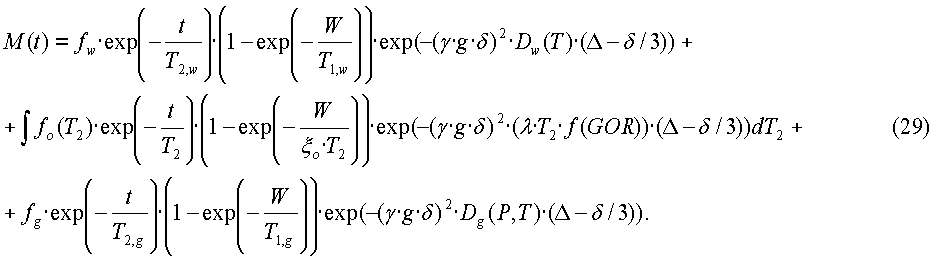 Последний член в уравнении (29) представляет собой вклад в измеренную поперечную намагниченность от газа в пробе флюида. В случае пластов, содержащих газированные нефти, давление флюида во время отбора пробы обычно выше точки начала кипения, так что в пробоотборник закачивается одна фаза (нефть). Однако могут быть случаи, когда в пробе присутствуют обе фазы, газа и нефти. Амплитуда сигнала от газа равна fg. Сигнал от газа спадает с одним временем T2,g(P,T) спин-спиновой релаксации, которое может быть измеренной или вычисленной функцией температуры и давления. Точно так же релаксация газа происходит с одним временем T1,g(P,T) T2,g(P,T) продольной релаксации, и для газа имеется один коэффициент Dg(P,T), который может быть измеренной или вычисленной функцией температуры и давления.