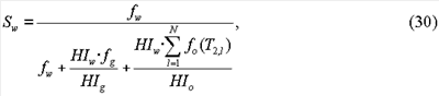 Инверсию уравнения (29) можно выполнить, используя способ «оконной обработки», описанный выше, или используя любой другой подходящий способ, известный в области техники, для согласования набора измерений по градиентам импульсного поля с уравнением (29). Такие способы включают в себя, например, способы наименьших квадратов, максимальной энтропии или другие способы с минимальной ошибкой. После инверсии можно легко определить объемы и насыщенности флюидов. Например, насыщенности флюидов могут быть определены в соответствии со следующими уравнениями: