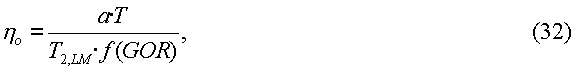 Вязкость нефти может быть вычислена на основании любых известных соотношений, которые связывают вязкость с временами релаксации. Например, логарифмическое среднее T2,LM одномерного распределения времен релаксации может быть связано с вязкостью ( о) нефти и соотношением газ/нефть определенным эмпирически уравнением, раскрытым в: Freedman et. al., 2001, A new NMR method of fluid characterization in reservoir rocks: Experimental confirmation and simulation results , SPE Journal, vol. 6, 4, p.452-464):