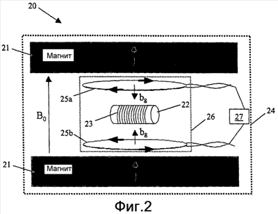 Датчик 20 ядерно-магнитного резонанса, показанный на фиг.2, также включает в себя две градиентные катушки 25а и 25b, которые выполнены с возможностью создания градиентов магнитного поля на объеме 22 пробы. Градиентные катушки 25а и 25b подключены к блоку 27 управления, который может возбуждать градиентные катушки 25а и 25b с выбранной мощностью в течение заданного отрезка времени. Хотя показаны две градиентные катушки 25а и 25b, обычному специалисту в области техники, к которой относится изобретение, должно быть понятно, что без отступления от объема изобретения можно использовать одну или несколько градиентных катушек. Во время действия градиентного импульса могут быть образованы противоположные магнитные поля bg для создания градиента g магнитного поля в объеме пробы. Градиент g магнитного поля обычно измеряют в единицах Гс/см. Датчик 20 может быть защищен и может поддерживаться корпусом 24. Корпус 24 может быть изготовлен из магнитной стали с высокой магнитной проницаемостью для удержания магнитного поля В0 и для придания прочности узлу.