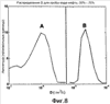 Одномерные функции распределения диффузии могут быть получены аналогичным образом путем интегрирования f(T2,D) по Т2 или путем суммирования fl,k по индексу l. Одномерная функция распределения диффузии, показанная на фиг.8, была вычислена по двумерной функции распределения (показанной на фиг.7) путем суммирования fl,k по индексу l. Это эквивалентно «проецированию» двумерной кривой на ось диффузии. На показанных на фиг.8 одномерных функциях распределения коэффициентов диффузии максимум А и максимум В отражают нефтяной пик и водный пик, соответственно, показанные на фиг.7.