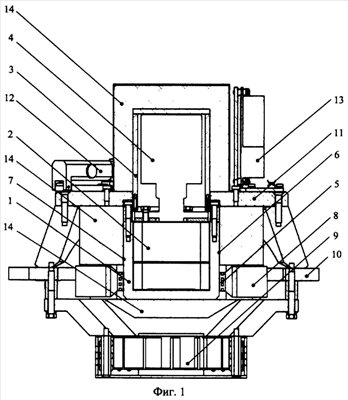 Устройство содержит термостат, состоящий из нижнего корпуса 1, в котором установлена упругая система гравиметра 2, и верхнего корпуса 3, в котором размещен фотоэлектрический преобразователь 4. Преобразователь соединен с упругой системой гравиметра 2 так, что обеспечивается возможность его поворота вокруг оси. На каждой из боковых стенок нижнего корпуса 1 установлено по два полупроводниковых модуля 5, работающих на эффекте Пельтье. В одну из стенок вблизи модулей вставлен образцовый терморезистор 6, выполняющий функции датчика системы термостабилизации, а на противоположной стенке – образцовый терморезистор 7, служащий для контроля температуры термостата. Для отвода тепла с горячих спаев модулей служат радиаторы 8, через которые прокачивается воздух с помощью вентилятора 9, установленного в нижней части основания устройства 10. Верхний корпус термостата 3 связан с основанием 10 посредством теплоизолирующего капролонового кольца 11. На кольце установлены два пузырьковых уровня 12, предназначенные для фиксации положения оси чувствительности упругой системы после ее выставки. На основании 10 размещена плата управления термостатом 13. Нижний и верхний корпусы термостата окружены теплоизолирующим материалом 14.