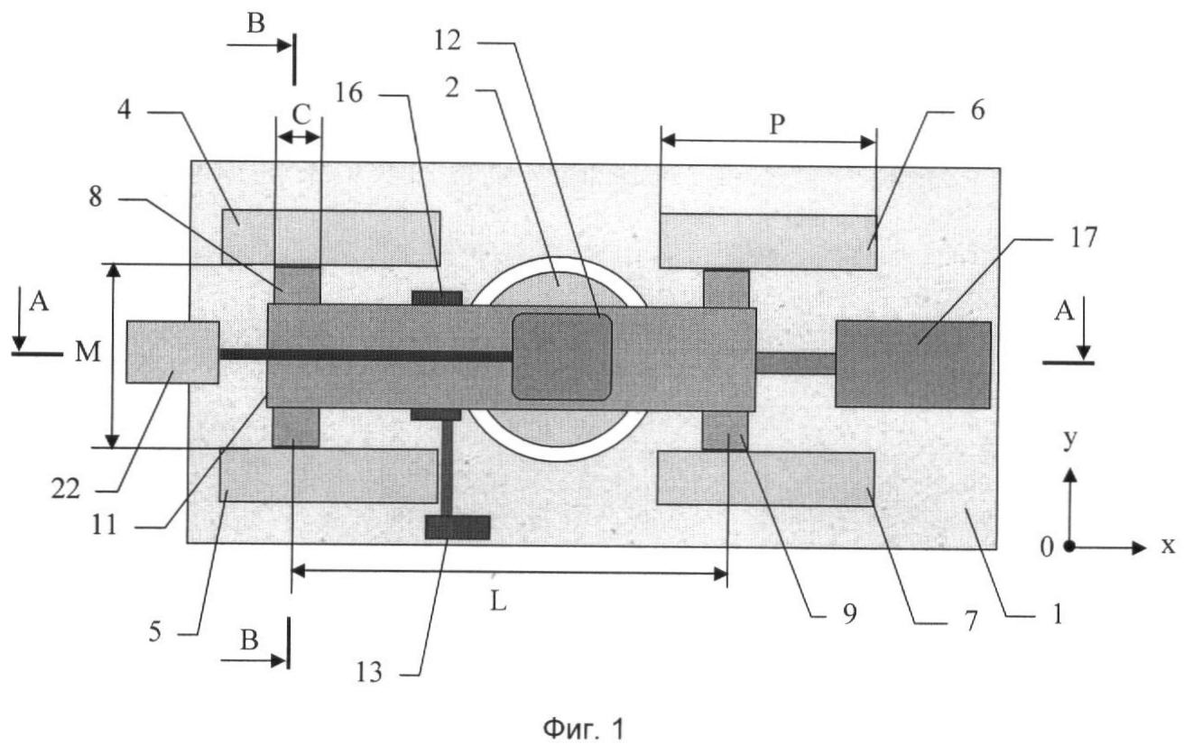 где h – расстояние от плоскости поверхности заготовки до центра лазерного пучка, связывающего интерферометр 16 и отражающий элемент 15, dx и dy – величины паразитного смещения (из-за перекосов) ползунов по координатам х и у при перемещении подвижного стола, L и М – соответственно расстояния между ползунами и направляющими. При h=20 мм dy=dy=1 мкм, М=200 мм и L=400 мм, х=0.05 мкм и у=0.1 мкм.