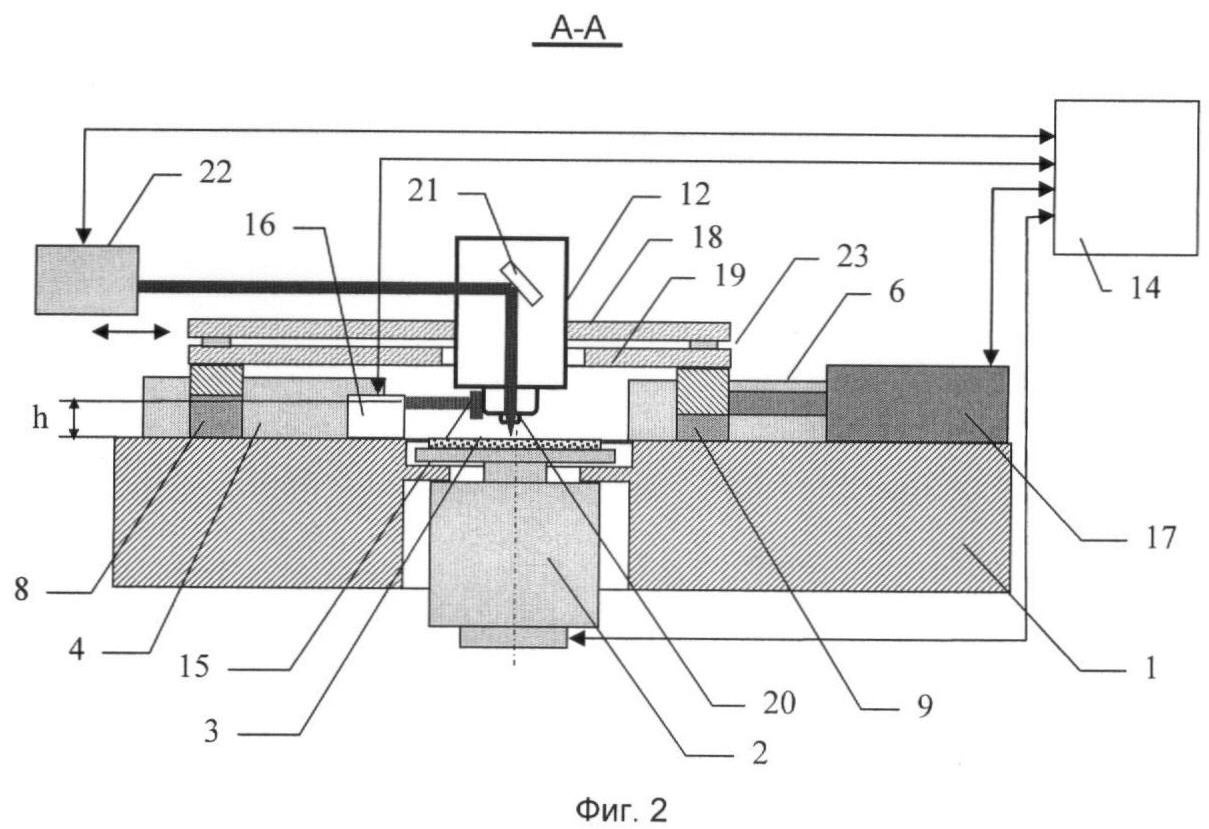 Плиты 18 и 19 выполнены с отверстиями, в которых установлена головка записи 12, корпус которой жестко связан с плитой 18. Отверстие в плите 19 имеет диаметр, позволяющий головке записи перемещаться в поперечном направлении при перемещении плиты 18. В корпусе головки записи установлен узел фокусировки, включающий в себя, как минимум, поворотное зеркало 21, фокусирующий микрообъектив 20 и отражательный элемент интерферометра 15. Фокусирующий микрообъектив (числовая апертура выбирается NA=0.65-0.95) установлен таким образом, что его оптическая ось проходит через ось вращения вала шпиндельного узла при перемещении подвижного стола вдоль направляющих, а плоскость фокусировки записывающего лазерного излучения совмещена с плоскостью лицевой поверхности заготовки 3.