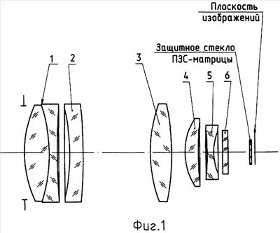 Объектив (фиг.1) состоит из положительного мениска 1, обращенного вогнутой поверхностью к пространству изображений и склеенного из двояковыпуклой и двояковогнутой линз, оптическая сила мениска равна 0,01175 мм-1, отрицательного мениска 2, обращенного вогнутой поверхностью к пространству предметов, его оптическая сила равна -0,00592 мм-1, двояковыпуклой линзы 3, ее оптическая сила равна 0,018 мм-1, положительного мениска 4, обращенного вогнутой поверхностью к пространству изображений, его оптическая сила равна 0,02676 мм-1, двояковогнутой линзы 5, ее оптическая сила равна -0,04697 мм-1. Оптические силы элементов объектива рассчитаны для длины волны =840 нм. Расстояние между одиночным отрицательным мениском и одиночной двояковыпуклой линзой равно 25 мм, что составляет 0,49 фокусного расстояния объектива. Расстояние между одиночной двояковыпуклой линзой и одиночным положительным мениском равно 5 мм, что составляет 0,098 фокусного расстояния объектива. Сумма оптических сил элементов объектива равна 0,00362 мм-1. Объектив рассчитан со светофильтром 6.