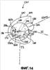 Теперь со ссылкой на фиг.14-16 будет описан принцип действия шарнира 130. Нa фиг.14 показан опорный элемент 140 в состоянии, в котором он соединен с элементом 180 с шаровой головкой (это соединение может быть осуществлено, например, способами горячего соединения во время изготовления шарнира). Шаровая головка 184 помещена в полость 146 полуоболочки 144. Диаметр головки 184 несколько меньше диаметра полости 146, так что головка 184 может вращаться в указанной полости 146 вокруг своего собственного центра – который, однако, удерживается неподвижным – без выскальзывания или выхода каким бы то ни было образом из той же самой полости 146.