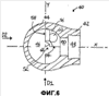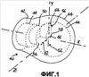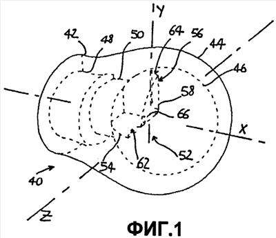 Внутри полости 46 полуоболочки 44 от ее поверхности вблизи отверстия 50 выдается выступ 52. Этот выступ 52 по существу занимает объем половины прямоугольного сектора шара, т.е. одну восьмую часть шара, образующего полость 46, при этом он имеет три полностью открытые поверхности 54, 56, 58, которые принадлежат трем взаимно перпендикулярным плоскостям. Поверхности 54 и 56 параллельны оси X, в то время как поверхность 58 перпендикулярна к этой оси и параллельна другой оси Y. Дополнительная ось Z перпендикулярна к плоскости, определяемой осями X и Y.