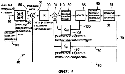 Пневматический выход реле 85 поступает в объемный бустер или клапан 65 с быстрым выпуском. Этот пневматический сигнал используется для управления приводом клапана привода 55, связанного с клапаном 60. Как показано на фиг.1, измеренный ход затвора клапана или положение штока клапана, с которым связан затвор клапана, поступает на сумматор 30 для сравнения с сигналом уставки хода, а также в усилительный модуль 95 обратной связи по скорости для получения усиления обратной связи по скорости. По меньшей мере один датчик (не показан) используется для определения измеряемого хода затвора клапана или положения штока клапана.
