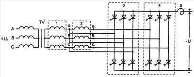 Отпайки секции 1 секционированных, соединенных по схеме звезда, вторичных обмоток трансформатора TV соединены с выходом трехфазного мостового инвертора 3. Отпайки секции 2, последовательно соединенной с первой секцией вторичных обмоток трансформатора, подключены к выходу трехфазного мостового инвертора 4. Трехфазные мостовые инверторы соединены по входу параллельно и через реактор подключены к шинам сети постоянного тока. Инвертор собран на запираемых тиристорах. Управление тиристорами выполняется фазовым способом. Тиристоры инвертора 3 отпираются в начале полупериода переменного напряжения и запираются с минимальным углом опережения выключения тиристоров. При выбранном уровне напряжения в сети постоянного тока рекуперация энергии в трехфазную сеть переменного тока выполняется инвертором 3. С повышением напряжения в сети постоянного тока угол опережения выключения тиристоров изменяется от максимальной до минимальной величины. Тиристоры инвертора 4 отпираются и запираются с изменяемыми углами регулирования и углами опережения выключения тиристоров в зоне регулирования в зависимости от уровня напряжения в сети постоянного тока. Во время непроводящего состояния тиристоров инвертора 4, электрическая энергия из сети постоянного тока рекуперируется инвертором 3 в трехфазную сеть переменного тока. Входы трехфазных мостовых инверторов через реактор 5 соединены к шинам сети постоянного тока.