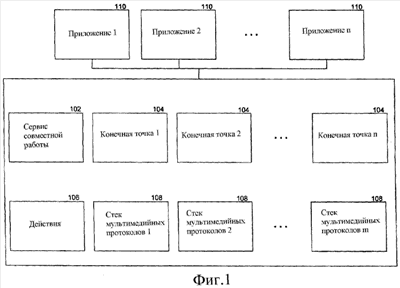 На фиг.1 показана блок-схема, иллюстрирующая компоненты архитектуры для расширяемой системы совместной работы в реальном времени согласно возможному варианту осуществления. Архитектура для расширяемой системы совместной работы в реальном времени содержит объект 102 сервиса совместной работы, множество объектов 104 конечных точек, объекты 106 действий и множество мультимедийных стеков 108. Одно или более приложений 110 могут использовать архитектуру путем доступа к различным методам, свойствам и событиям, связанным с архитектурой. Разработчик приложения, создающий приложение, может использовать архитектуру путем применения унифицированного интерфейса API вместо необходимости изучения и реализации различных интерфейсов API для каждого мультимедийного стека, протокола или другого компонента, который может использовать приложение или архитектура.