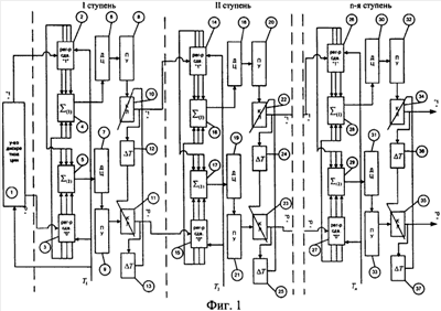 При работе устройства обработки сложных квазиоптимальных сигналов радиочастотное колебание преобразуется в дискретизированный по времени и амплитуде сигнал. Составные части сигнала оптимально обрабатываются в последовательно расположенных n ступенях. В первой, второй и последующих ступенях активными «1» и «0» формируется двоичный код. На запись в регистры сдвига прямого 2, 14, 26 и инверсного 3, 15, 27 кодов совместно с тактовыми импульсами T1, Т2, Тn подаются сигналы «1» или «0». При входном коде последующих ступеней декодирования «1» или «0» пик автокорреляционной функции выделяется на первых 4, 16, 28 и вторых 5, 17, 29 сумматорах. Постоянные составляющие сигнала снимаются на первых 6, 18, 30 и вторых 7, 19, 31 устройствах ступеней. На первых 8, 20, 32 и вторых 9, 21, 33 пороговых устройствах ступеней амплитуда сигналов сравнивается с пороговыми значениями, при превышении которых формируются импульсные сигналы «1» или «0». Импульсные сигналы, пройдя ключевые схемы «1» 10, 22, 34 или ключевые схемы «0» 11, 23, 35, являются выходными сигналами. Сигнал с выхода «1» запускает первые таймеры 12, 24, 36 на время действия которого закрываются ключевые схемы «0» 11, 23, 35. Сигнал с выхода «0» запускает вторые таймеры 13, 25, 37 на время действия которого закрываются ключевые схемы «1» 10, 22, 34. Для последней ступени импульсный сигнал «1» или «0», пройдя ключевые схемы, является выходным сигналом информационного кода, запускающим соответствующий таймер, защищая несанкционированную выдачу сигнала противоположного значения. В качестве варианта – в каждой ступени декодирования допустимо использование одного регистра сдвига и с него снимать две группы прямых и инверсных кодов, которые соединяются с входами соответствующих сумматоров.