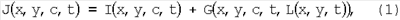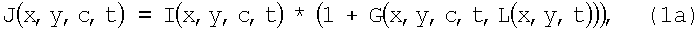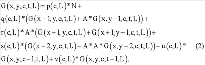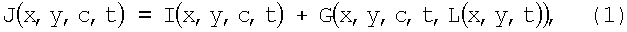 где L(x, у, t) является показателем локальной интенсивности в изображении и G(x, у, с, t, L(x, у, t)) определяет значение зерна. Одной возможной реализацией является определение L как яркости или взвешенной суммы интенсивностей I (х, у, с, t) по всем цветовым каналам.