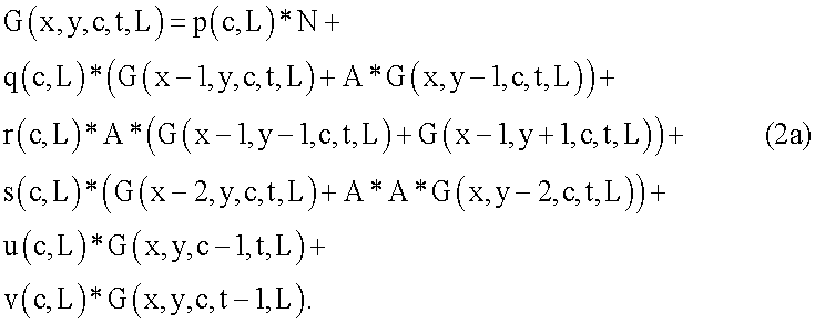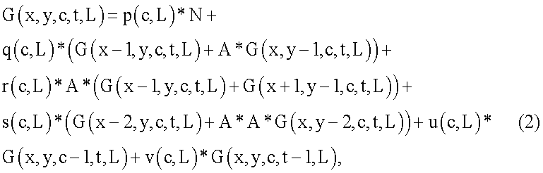 Как может быть замечено из структуры уравнения (2), значения зерна для данного пикселя в данном цветовом канале вычисляются рекурсивно с использованием предварительно вычисленных значений зерна. В частности, кадры вычисляются в порядке возрастания номера кадра (то есть с возрастанием t). Внутри каждого кадра обработка цветовых каналов происходит в порядке возрастания номера цветового канала (то есть с возрастанием с). Внутри каждого цветового канала пиксели растеризуются горизонтально и затем вертикально в порядке возрастания х и у. При следовании указанному порядку все значения зерна, требуемые в уравнении (2), вычисляются предварительно автоматически.