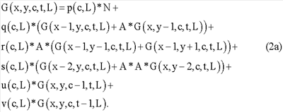 В возможном варианте осуществления для моделирования пространственной корреляции может использоваться авторегрессионная схема второго порядка, а для моделирования межцветовой и временной корреляций может использоваться регрессионная схема первого порядка. Все коэффициенты корреляции зависят от интенсивности декодированного изображения. Горизонтальные и вертикальные коэффициенты пространственной корреляции связаны постоянным коэффициентом аспектного отношения. При таких условиях смоделированные значения зерна должна выдавать следующая формула: