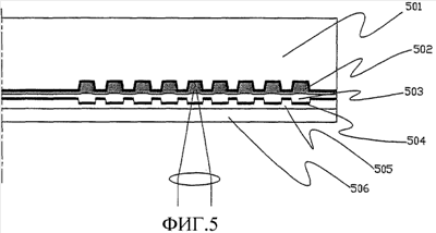 На Фиг.5 представлен схематический вид, показывающий устройство оптического диска по второму варианту реализации. Этот диск имеет два записывающих слоя. Второй записывающий слой 502, который расположен дальше от лазерного луча, может быть сформирован на подложке 501 с использованием органического красителя методом центрифугирования. Подложка 501 изготавливается таким же образом, как и в первом варианте реализации. Затем накладывается промежуточный слой 503, имеющий направляющую спиральную дорожку на поверхности. Направляющая спиральная дорожка, сформированная на промежуточном слое 503, используется для записи информации на и воспроизведения информации с первого записывающего слоя 504, который расположен ближе к лазерному свету, и также может быть сформирована с помощью матрицы, которая изготавливается с помощью мастер-диска. Первый записывающий слой 504, основным компонентом которого может быть пленка оксида Te, может быть сформирован на поверхности промежуточного слоя 503 методом напыления. Защитный слой 506 из поликарбоната, имеющий толщину примерно 60 мкм, присоединен к поверхности второго записывающего слоя с помощью УФ-отверждаемого полимерного слоя 505. Способ для наложения промежуточного слоя 503 описан в публикации японской заявки No. 2003-203402(A), которая включена здесь посредством ссылки.