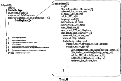 Фиг.6 иллюстрирует синтаксис структур данных подпути и подэлемента списка воспроизведения в соответствии с иллюстративными вариантами воплощения настоящего изобретения. Как показано, синтаксис структуры данных “SubPath()” подпути, который обозначает путь дополнительных данных, относящихся к основным аудиовизуальным данным, включенным в один список PlayList воспроизведения, имеет поле длины, поле “SubPath_type”, поле “is_repeat_SubPath”, поле “number_of_SubPlayItems” и поле “SubPlayltem(i)”.