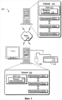Хотя клиент 104 описан в среде терминальных служб, в которой совокупность приложений 108(1)-108(N) выполняется на сервере 102, клиент 104 может также выполнять одно или несколько из совокупности приложений 120(1),…, 120(m),…, 120(M). Например, одно из приложений 120(1)-120(M) может обеспечивать интерфейс, используемый в сочетании с RDP 114 для представления данных для просмотра пользователем и для приема вводов от пользователя, например, с помощью мыши 108 и/или клавиатуры 110. Кроме того, хотя модули 116, 118 сжатия и восстановления после сжатия проиллюстрированы как часть соответствующих протоколов RDP 112, 114, модули 116, 118 сжатия и восстановления после сжатия могут действовать как автономные программные компоненты, которые выполняются для сжатия и восстановления после сжатия потоковых данных соответственно.