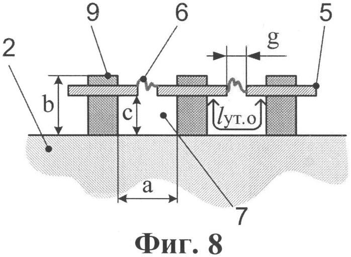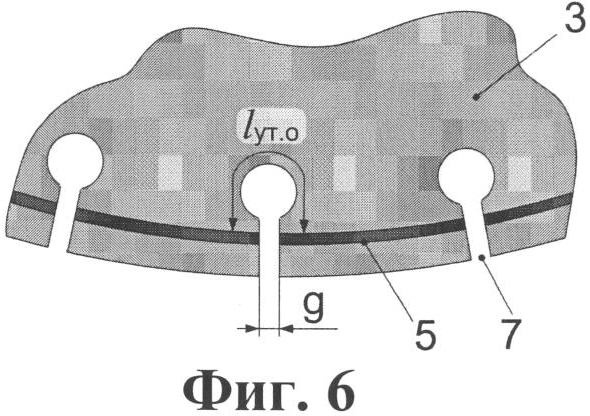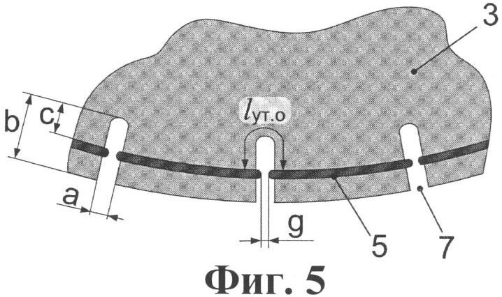 Как наглядно показано в увеличенном масштабе на фиг.5, средства компенсации, обеспечивающие в данном варианте увеличение lут.0 пути утечки между электродами, выполнены в виде слоя материала изоляционного ребра 3, отделяющего электроды 5 от поверхности изоляционного ребра 3, и прорезей 7. Достоинством этого варианта является более высокая технологичность изготовления и возможность задания требуемой длины lут.0 пути утечки простым изменением глубины b прорези 7, т.е. варьированием глубины с той ее части, которая находится на большей глубине относительно электродов 5, и/или толщины слоя материала, отделяющего электроды от поверхности. Кроме того, из фиг.5 видно также, что еще одна возможность увеличения значения lут.0 состоит в выполнении прорезей 7 с шириной а>g.