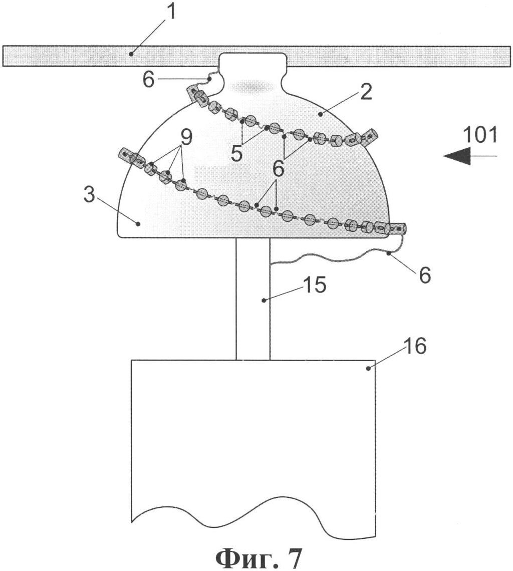 На фиг.7, 8 показан третий вариант осуществления изолятора по изобретению. В этом варианте он представляет собой штыревой изолятор 101, закрепленный на опоре 16 посредством своей второго элемента 15 арматуры в виде штыря. На поверхности колоколообразного изоляционного тела 2 по спиральной траектории установлены m изоляционных элементов 9. Эти элементы в данном варианте образуют средства компенсации, обеспечивающие увеличение пути утечки между электродами 5, которые закреплены внутри изоляционных элементов 9 и выступают из них. Изоляционные элементы 9, например, в форме пластин, брусков или цилиндров, могут быть выполнены, в частности, из силиконовой резины и приклеены к изоляционному телу 2.