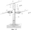 На фиг.13 представлен вариант выполнения ВЛЭ 10 кВ (обозначенной, в целом, как 110) с использованием варианта изолятора по фиг.1, 2. ВЛЭ 10 кВ наиболее часто отключаются от индуктированных перенапряжений. Как уже упоминалось, для защиты от таких отключений в России используются разрядники РДИП-10. Они устанавливаются по одному на опору с чередованием фаз. Например, на первой опоре такой разрядник устанавливается на фазу А, на второй – на фазу В, на третьей – на фазу С и т.д. Как показано на фиг.13, аналогичным способом, т.е. по одному на опору с чередованием фаз, могут быть установлены и изоляторы по изобретению, например, изоляторы 100 со спиральным ребром по фиг.1-6 или штыревые изоляторы 101 по фиг.7, 8. Остальные изоляторы 18 могут быть традиционного исполнения. Альтернативно, на одну из фаз может быть установлена гирлянда тарельчатых изоляторов 102 по изобретению (проиллюстрированных фиг.9-12).