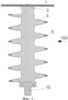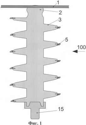Как показано на фиг.1, 2, для фиксации высоковольтного (находящегося под высоким напряжением) провода 1, входящего, например, в состав ВЛЭ (типа показанной на фиг.13), может быть использован одиночный опорный цилиндрический изолятор 100, содержащий цилиндрическое изоляционное тело 2 со спиральным изоляционным ребром 3, выполненное из твердого диэлектрика, например из фарфора. При помощи металлической арматуры, состоящей из первого (верхнего) элемента арматуры (не изображен) и второго (нижнего) элемента 15 арматуры, он соединен соответственно с высоковольтным проводом 1 и с проводящей заземленной опорой 16 (см. фиг.13).