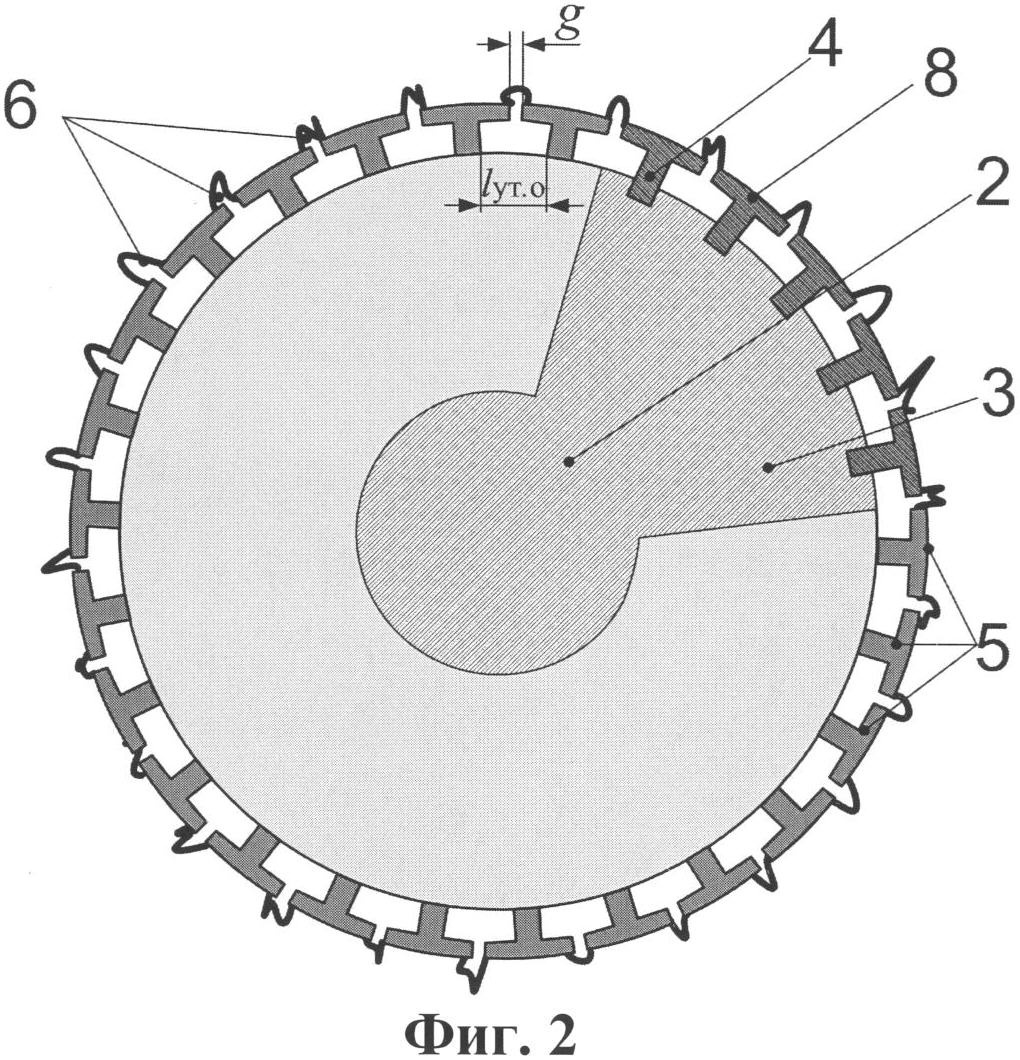 Как показано в увеличенном масштабе на фиг.6, для увеличения пути утечки lут.0 прорези 6 могут быть выполнены фигурными. Например, участки прорезей 7, расположенные глубже электродов 5, могут быть выполнены в виде круговых цилиндров или иметь какую-либо иную форму, при которой расстояния между противолежащими сторонами участков прорезей 7, расположенных глубже электродов 5, превышают ширину прорезей у поверхности ребра 3 изоляционного тела 2. Очевидно, что такое выполнение прорезей также обеспечивает увеличение lут.0, т.е. повышение эффективности средств компенсации сокращения длины пути утечки изолятора 100 в результате использования электродов 5.