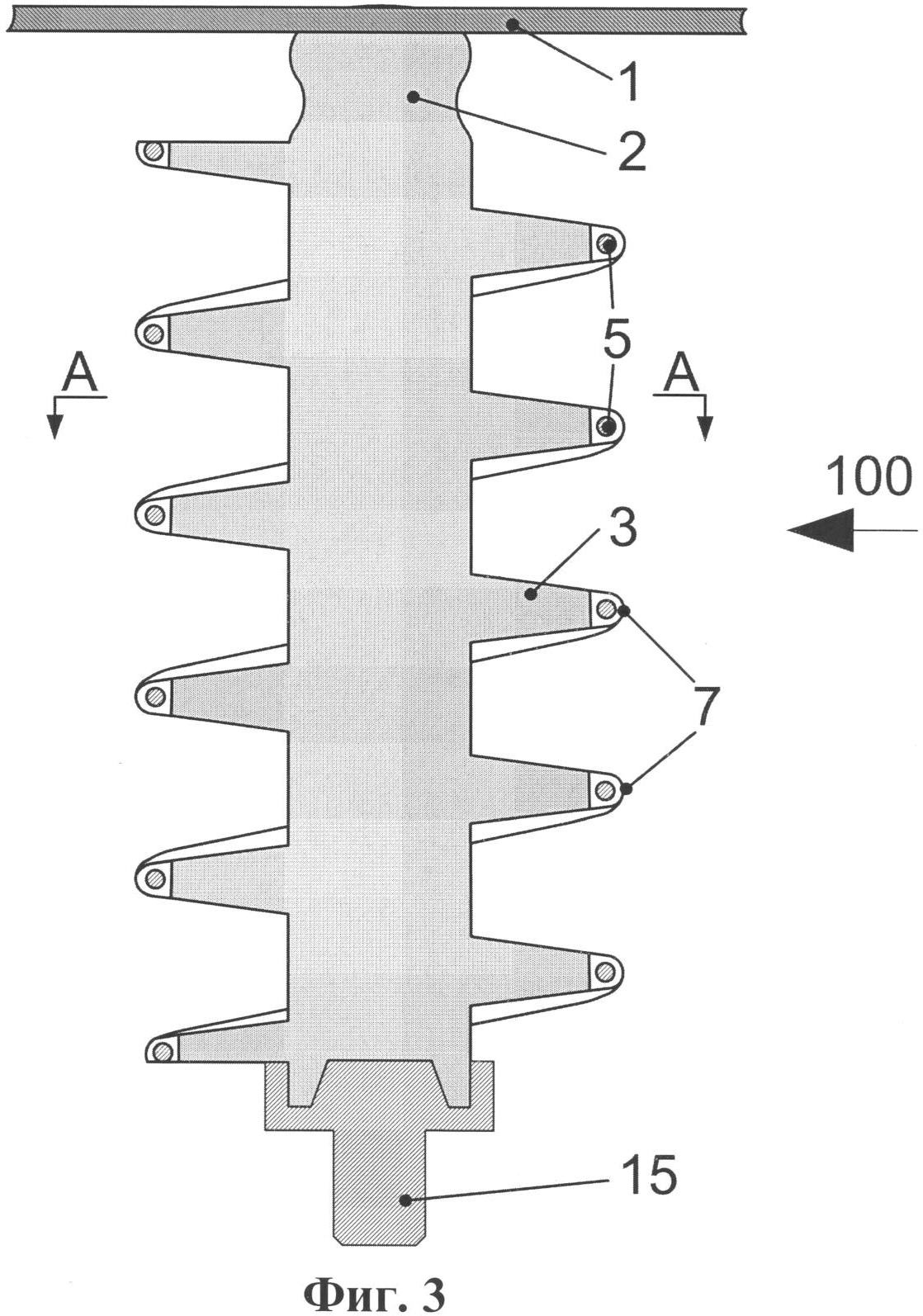 На фиг.3, 4 показан второй вариант осуществления изолятора по изобретению, который также представляет собой цилиндрический изолятор 100 с арматурой, состоящей из двух элементов (на фиг.3 показан только второй элемент 15), со спиральным ребром 3 и с вмонтированными в это ребро электродами 5 МЭС. Однако в данном варианте электроды 5 выполнены в виде отрезков металлических цилиндров, которые, в отличие от предыдущего варианта, расположены не снаружи, а внутри изолятора 100 (в данном случае – внутри его спирального ребра 3). При этом в спиральном ребре 3 выполнены прорези 7, например, в форме щелей глубиной b (превышающей глубину расположения электродов 5) и шириной а g. В результате электроды 5 оказываются отделенными друг от друга небольшими искровыми разрядными промежутками длиной g (составляющей в предпочтительных вариантах несколько миллиметров).