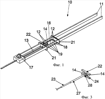 Скользящая направляющая состоит из продольной рейки, образующей часть центрального стержневого элемента 13 и связанной с шестерней (не показана), которая, в свою очередь, присоединена к рабочему устройству 17, чтобы оператор мог привести ее в движение.