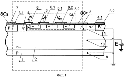 На фиг.1 представлен схематический разрез КМОП-фотоприемного элемента согласно настоящему изобретению. Область фотоприемного элемента ограничена прямоугольником, обозначенным пунктирной линией. Во второй, меньшей по размеру, обозначенной пунктиром области С1 изображены транзисторы схемы фотоприемного элемента V1, V2, V3, их число может быть различным для различных типов схем.