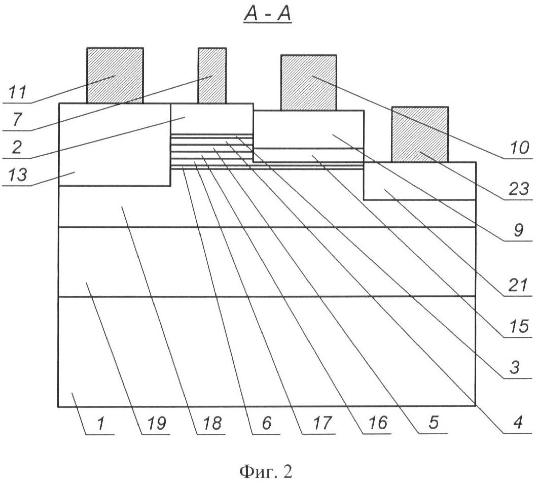 Функциональным аналогом заявляемого объекта является интегральный логический элемент «НЕ» на гетеропереходных транзисторах с высокой подвижностью носителей (см. Шур М. Современные приборы на основе арсенида галлия. – М.: Мир, 1991. – 632 с, фиг.9.6.11, с.476), содержащий полуизолирующую GaAs-подложку, AlGaAs-область второго типа проводимости, расположенную под ней первую AlGaAs-область спейсера собственной проводимости, расположенную под ней область первого канала собственной проводимости, область второго канала собственной проводимости, вторую AlGaAs-область спейсера собственной проводимости, входную металлическую шину, расположенную над AlGaAs-областью второго типа проводимости и образующую с ней переход Шоттки, выходную область второго типа проводимости, выходную металлическую шину, соединенную с выходной областью второго типа проводимости, металлическую шину питания, металлическую шину нулевого потенциала, область нулевого потенциала второго типа проводимости, соединенную с металлической шиной нулевого потенциала, расположенную над второй AlGaAs-областью спейсера собственной проводимости вторую AlGaAs-область второго типа проводимости, металлический затвор, образующий переход Шоттки со второй AlGaAs-областью второго типа проводимости и соединенный с выходной металлической шиной, область питания второго типа проводимости, граничащую с областью второго канала собственной проводимости и соединенную с металлической шиной питания, причем GaAs-области первого и второго каналов собственной проводимости расположены над полуизолирующей GaAs-подложкой.