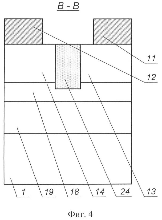 Работает устройство следующим образом. При подаче напряжения питания на металлическую шину 11, соединенную с областью питания первого типа проводимости 13, относительно металлической шины нулевого потенциала 12, соединенной с областью нулевого потенциала второго типа проводимости 14, изолированной от области питания 13 областями аморфизации 24, и действующем низком уровне напряжения логического нуля на входной металлической шине 7, образующей переход Шоттки с AlGaAs-областью второго типа проводимости 2, и высоком уровне напряжения логической единицы на дополнительной входной металлической шине 20, соединенной с AlGaAs-областью первого типа проводимости 19, граничащей с полуизолирующей подложкой 1 и образующей p-n-переход с дополнительной AlGaAs-областью второго типа проводимости 18, электроны, перешедшие в InGaAs-область первого канала собственной проводимости 4 из AlGaAs-области второго типа проводимости 2 и пространственно изолированные от ионов примеси первой AlGaAs-областью спейсера собственной проводимости 3, под действием электрического поля управляющих переходов туннелируют в сверхрешетке второго типа из квантовой ямы, образованной в зоне проводимости InGaAs-областью первого канала собственной проводимости 4, через барьер, образованный в зоне проводимости GaSbAs-областью второго канала собственной проводимости 5, в квантовую яму, образованную в зоне проводимости InGaAs-областью третьего канала собственной проводимости 16, а дырки под действием электрического поля управляющих переходов туннелируют в сверхрешетке второго типа из квантовой ямы, образованной в валентной зоне GaSbAs-областью четвертого канала собственной проводимости 17, через барьер, образованный в валентной зоне InGaAs-областью третьего канала собственной проводимости 16, в квантовую яму, образованную в валентной зоне GaSbAs-областью второго канала собственной проводимости 5, в результате чего проводимость InGaAs-области первого канала 4, граничащей с областью нулевого потенциала второго типа проводимости 14 и выходной областью второго типа проводимости 8, изолированной от дополнительной выходной области второго типа проводимости 22 разделительной AlGaAs-областью собственной проводимости 15, низкая, проводимость InGaAs-области третьего канала 16, граничащей с областью нулевого потенциала второго типа проводимости 14 и дополнительной выходной областью второго типа проводимости 22, изолированной от выходной области второго типа проводимости 8 разделительной AlGaAs-областью собственной проводимости 15, высокая, проводимость GaSbAs-области второго канала 5, граничащей с областью питания первого типа проводимости 13 и выходной областью первого типа проводимости 9, изолированной от дополнительной выходной области первого типа проводимости 21 разделительной AlGaAs-областью собственной проводимости 15, высокая, проводимость GaSbAs-области четвертого канала 17, граничащей с областью питания первого типа проводимости 13 и дополнительной выходной областью первого типа проводимости 21, изолированной от выходной области первого типа проводимости 9 разделительной AlGaAs-областью собственной проводимости 15, низкая.