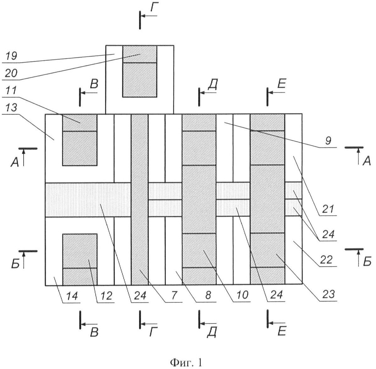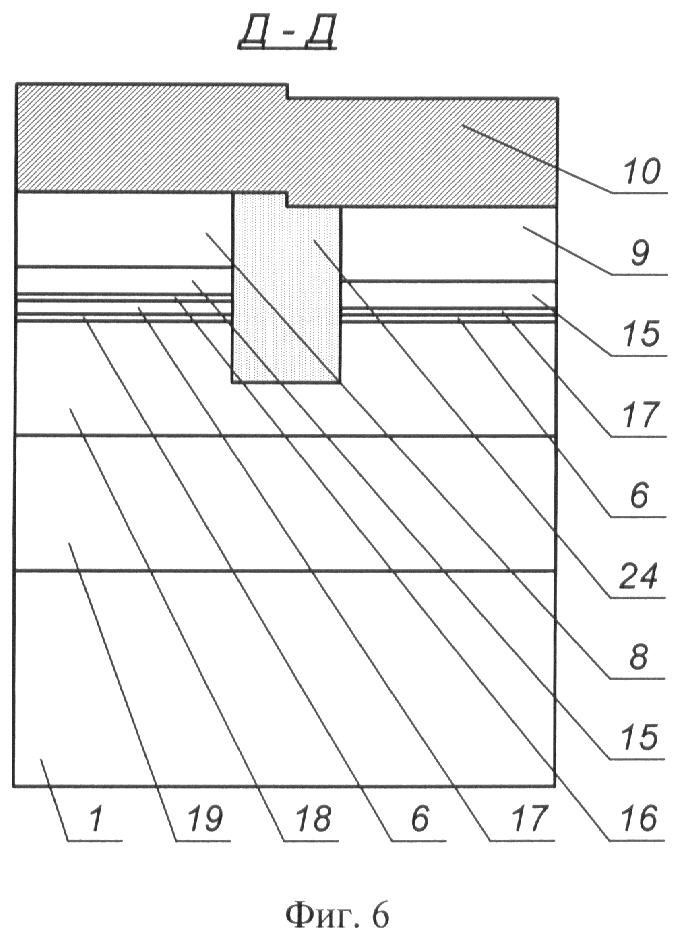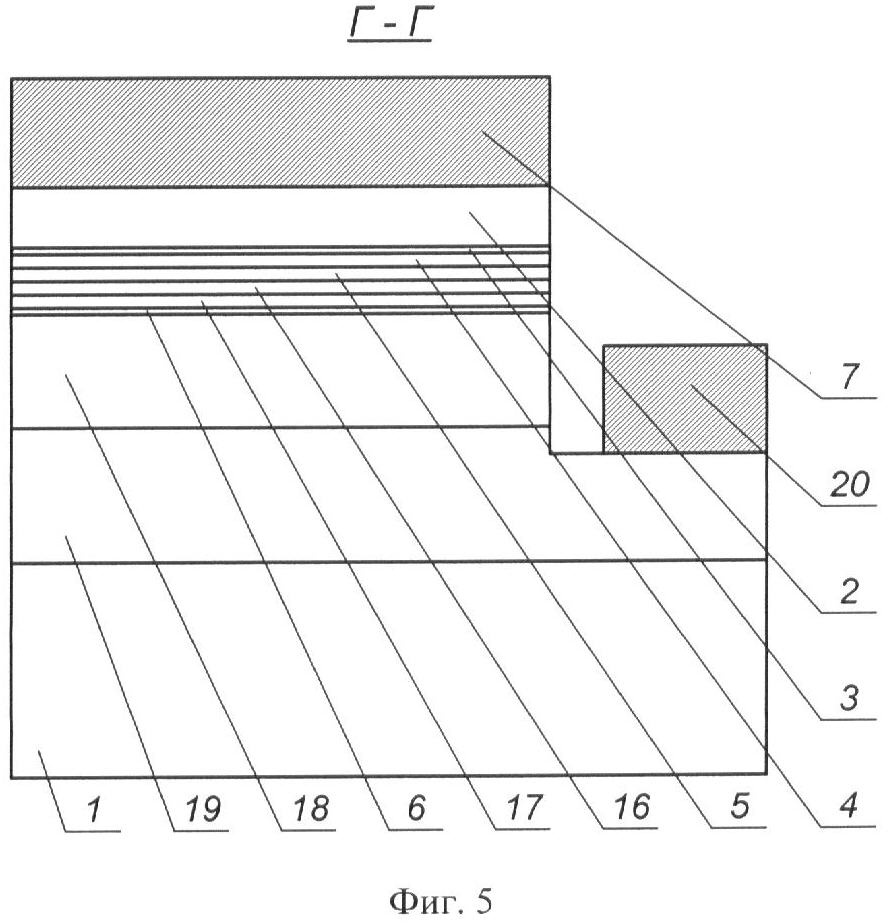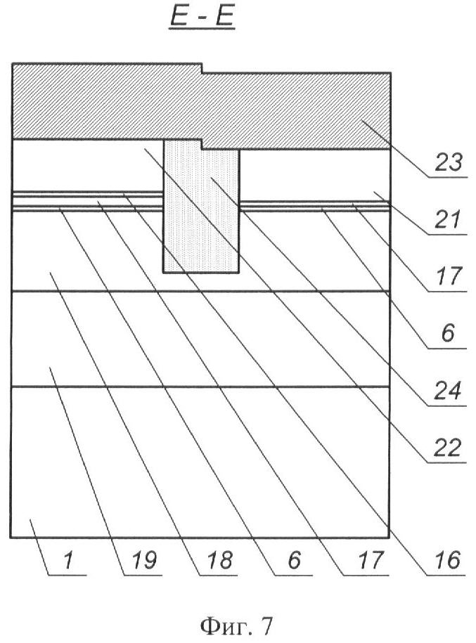 На фиг.1 приведена топология предлагаемого интегрального логического элемента «НЕ» на основе сверхрешетки второго типа. На фиг.2 приведено сечение предлагаемого интегрального логического элемента по областям первого типа проводимости. На фиг.3 приведено сечение предлагаемого интегрального логического элемента по областям второго типа проводимости. На фиг.4 приведено сечение предлагаемого интегрального логического элемента по областям питания и нулевого потенциала. На фиг.5 приведено сечение предлагаемого интегрального логического элемента по областям каналов. На фиг.6 приведено сечение предлагаемого интегрального логического элемента по выходным областям. На фиг.7 приведено сечение предлагаемого интегрального логического элемента по дополнительным выходным областям.