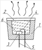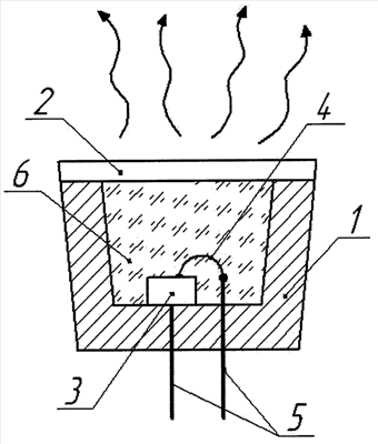 На чертеже схематически изображен светоизлучающий элемент в разрезе. Прибор содержит: корпус – 1; оптически прозрачную крышку – 2; кристалл – 3 с полупроводниковой структурой на основе нитридов группы АIIIВV, а также их тройных и четверных соединений, эмитирующий свет на длине волны 210-410 нм; проволоку – 4, соединенную с электрическим выводом 5; частицы легированного кубического нитрида бора (cBN) в виде порошка – 6 формируют равномерный слой светоизлучающего вещества. Возможен вариант беспроволочного соединения кристалла.