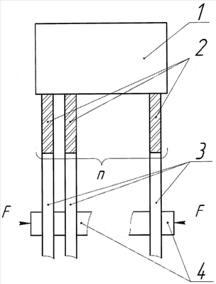 На первом этапе при зафиксированных в фрикционном держателе 4 свободных концах направляющих элементов 3 на все n пьезопреобразователей 2 одновременно подают одинаковое электрическое напряжение. Под действием напряжения пьезопреобразователи деформируются в продольном направлении, и каретка 1 перемещается на шаг.
