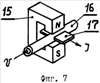 Перед включением магнитоэлектрического двигателя необходимо ручкой управления 10 выключить муфту и разъединить ведущий 6 и ведомый 7 валы. После включения электромагнитодинамического двигателя 14 постоянный ток I поступает на щетки 17, при этом щетки должны касаться одновременно не менее четырех шариков 25. Электрический ток проходит через шарики 25, находящиеся в магнитном поле С-образного магнита 15 и на них действует возникающая динамическая сила F, заставляя их перемещаться со скоростью V и через зубья шестерни 21 вращать ведущий вал 6 с небольшой скоростью. Если посмотреть на фиг.6, где представлена картина магнитного поля магнита 11, то видно, что магнитное поле сосредоточено на полюсах, а в средней части, на фиг.6 показано пунктирными линиями, оно вовсе отсутствует. Поэтому при движении шариков 25 при подходе их к верхнему 12 и нижнему 13 вертикальным каналам они, под действием магнитного поля, с ускорением втягиваются внутрь магнита 11 с силами F1 и F2. Те шарики 25, которые находятся в средней части магнита, будут беспрепятственно выходить из него и двигаться дальше по трубопроводам 19, 20. В результате непрерывного воздействия магнитного поля магнита 11 скорость движения шариков 25 будет возрастать, а крутящий момент будет определяться равнодействующей силой Fp. Как только зубчатая шестерня 21 и вместе с ней ведущий вал 6 достигнут максимальной частоты вращения и максимального вращающего момента поворачивается ручка управления 10. Ведущая полумуфта 9 прижимается к ведомой полумуфте 8 и ведомый вал 7 начинает вращаться и приводить в движение механизм, который с ним соединен. Частота вращения ведомого вала 7 и ведущего вала 6 может изменяться в ту или иную сторону при увеличении или уменьшении тока, подаваемого на щетки 17 электромагнитодинамического двигателя. Магнитоэлектрический двигатель не реверсивный и не может вращаться в противоположную сторону. Для его остановки необходимо прекратить подачу электрического тока на щетки 17 электромагнитодинамического двигателя и после остановки ведущего вала 6 отключить муфту. Таким образом, при работе предлагаемого двигателя кроме энергии электрического тока для вращения ведомого вала 7 используется энергия магнитного поля. Все усилительные элементы 5 работают одинаково и одновременно. Для того, чтобы мощность на обоих валах была максимальной, магниты 11 должны иметь большую магнитную напряженность и быть изготовленными из сплавов, в которые входят редкоземельные элементы.