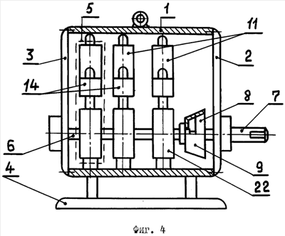 Указанная цель согласно изобретению обеспечивается тем, что ролик с магнитами, вертикальная ось и электромагнит заменены ведущим и ведомым валами, причем задний конец ведущего вала установлен в подшипнике задней крышки, а передний конец вставлен в торец ведомого вала, свободный конец которого пропущен в отверстие передней крышки, причем оба вала связаны друг о другом посредством муфты, которая кинематически соединена с ручкой управления, установленной снаружи корпуса, несколькими усилительными элементами, одинаковыми по конструкции, связанных с ведущим валом, каждый из которых содержит постоянный магнит, выполненный в форме прямоугольного бруска, установленного вертикально, внутри которого выполнены верхний и нижний вертикальные каналы, входное отверстие верхнего вертикального канала открывается на торцевую поверхность одного магнитного полюса, а входное отверстие нижнего вертикального канала открывается на торцевую поверхность другого магнитного полюса, причем выходные отверстия верхнего и нижнего вертикальных каналов выходят на среднюю часть постоянного магнита, на противоположные стороны, где напряженность магнитного поля самая минимальная, кроме того, каждый усилительный элемент имеет электромагнитодинамический линейный двигатель, состоящий из С-образного магнита, между полюсами которого установлена электроизоляционная трубка, имеющая сквозные соосные пазы, в которые вставлены две щетки, подключенные к клеммам клеммовой коробки, причем выходное отверстие верхнего вертикального канала соединено трубопроводом с входным отверстием электроизоляционной трубки электромагнитодинамического линейного двигателя, а входное отверстие упомянутого канала соединено трубопроводом с выходным отверстием нижнего вертикального канала, кроме того, зубчатая шестерня усилительного элемента закреплена на ведущем валу и размещена в круглом корпусе, входное отверстие которого трубопроводом соединено с выходным отверстием электроизоляционной трубки электромагнитодинамического линейного двигателя, а выходное отверстие круглого корпуса соединено трубопроводом с входным отверстием нижнего вертикального канала, кроме того, верхний и нижний вертикальные каналы, трубопроводы, электроизоляционная трубка электромагнитодинамического линейного двигателя, круглый корпус зубчатой шестерни заполнены стальными шариками, контактирующими друг с другом и с щетками электромагнитодинамического линейного двигателя, причем каждый шестой шарик выполнен из ферросплава, не проводящего электрический ток, а все трубопроводы выполнены из немагнитного материала.
